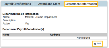 Navigate to the Department Information tab and click the Add button in the Department Payroll Coordinator(s) section.