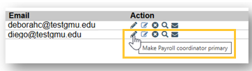 Hover over the icons in the Action column to see which actions are available. To change the Primary Department Coordinator, click the Make Payroll Coordinator Primary icon.