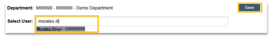 The Manage Assignments window will appear after selecting the +Add button. Enter the name of the employee to add as a Primary Department Payroll Coordinator in the Select User field. Click the name of the user from the search field to select that employee.