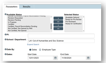 NOTE: Because Mason grants have overlapping reporting periods, the date parameter is going to include any periods that have payroll during the months defined in the reporting parameters. Once the report results are displayed, you can click on the header Nickname which is the Reporting Period Start and End Dates to sort by reporting period. You can also export all reports to excel to allow you to sort, filter, pivot the data easily.