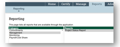 Using the Project Status Report (Navigation: Reports Tab > Reporting > Under the Management Category, Select Project Status Report.