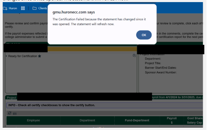 I am receiving an error when trying to certify: ‘The Certification Failed because the statement has changed since it was opened. The statement will refresh now.’ How do I workaround this issue?