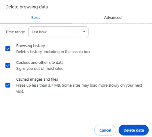 - Ensure that the “Cookies and other site data” is checked (the others are optional if you want to delete them or not).